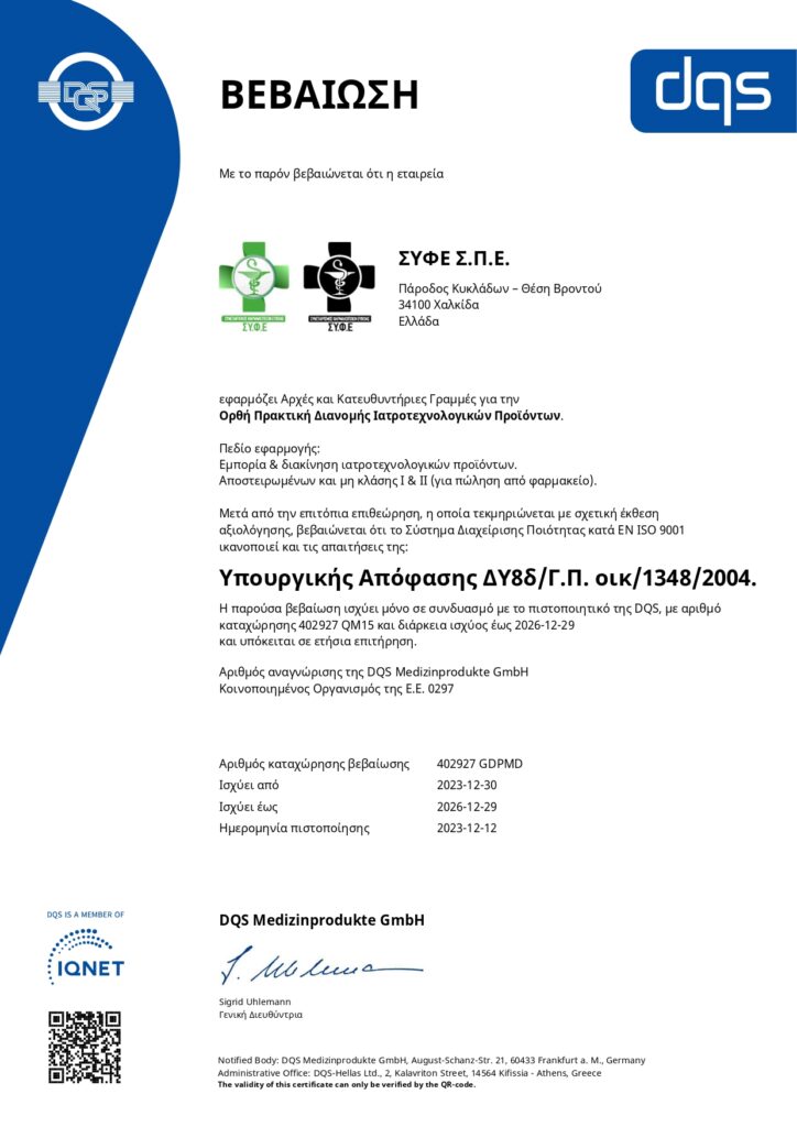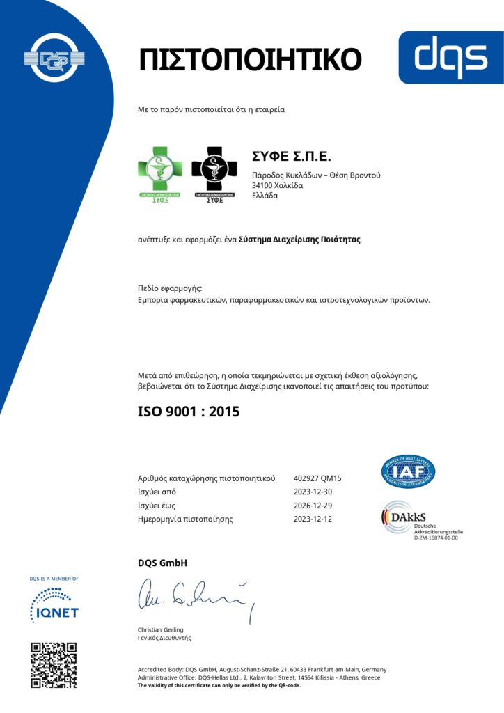 Με κεντρικό άξονα τη διασφάλιση υψηλής ποιότητας προϊόντων και υπηρεσιών, διαθέτουμε πιστοποίηση ISO 9001:2015 για την εισαγωγή, εμπορία και διακίνηση φαρμακευτικών και παραφαρμακευτικών προϊόντων. To σύστημα ποιότητας που εφαρμόζουμε είναι ζωτικής σημασίας για τον συνεταιρισμό καθορίζει όλα τα στάδια και τη λειτουργία των τμημάτων του, και διέπει κάθε δραστηριότητα του, προκειμένου να επιτευχθεί το καλύτερο ποιοτικό αποτέλεσμα. Επίσης, ο Συνεταιρισμός μας διαθέτει τη βεβαίωση Συμμόρφωσης με την ΔΥ8δ/Γ.Π, όσον αφορά τη διακίνηση ιατροτεχνολογικών προϊόντων.